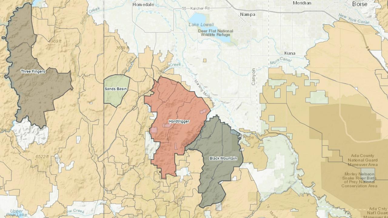 The scope includes the Sands Basin, Hardtrigger and Black Mountain HMAs in western Idaho, with AMLs of 64, 130 and 60, respectively.