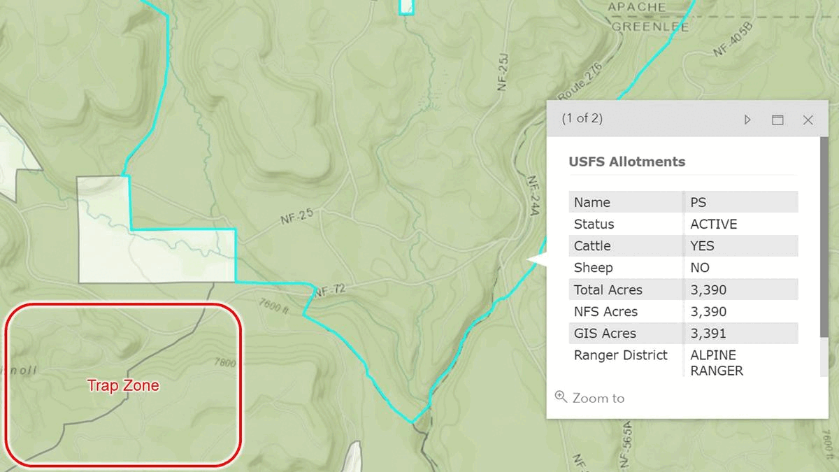 The Western Watersheds map shows Road #25 in the PS Allotment, about 15 miles southwest of Alpine and near the area where the Jumping Mouse horses were trapped earlier this year.