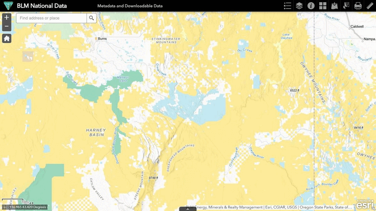In this map from the National Data Viewer, areas of critical environmental concern are marked in gray, HAs are black, HMAs are orange and grazing allotments are green.