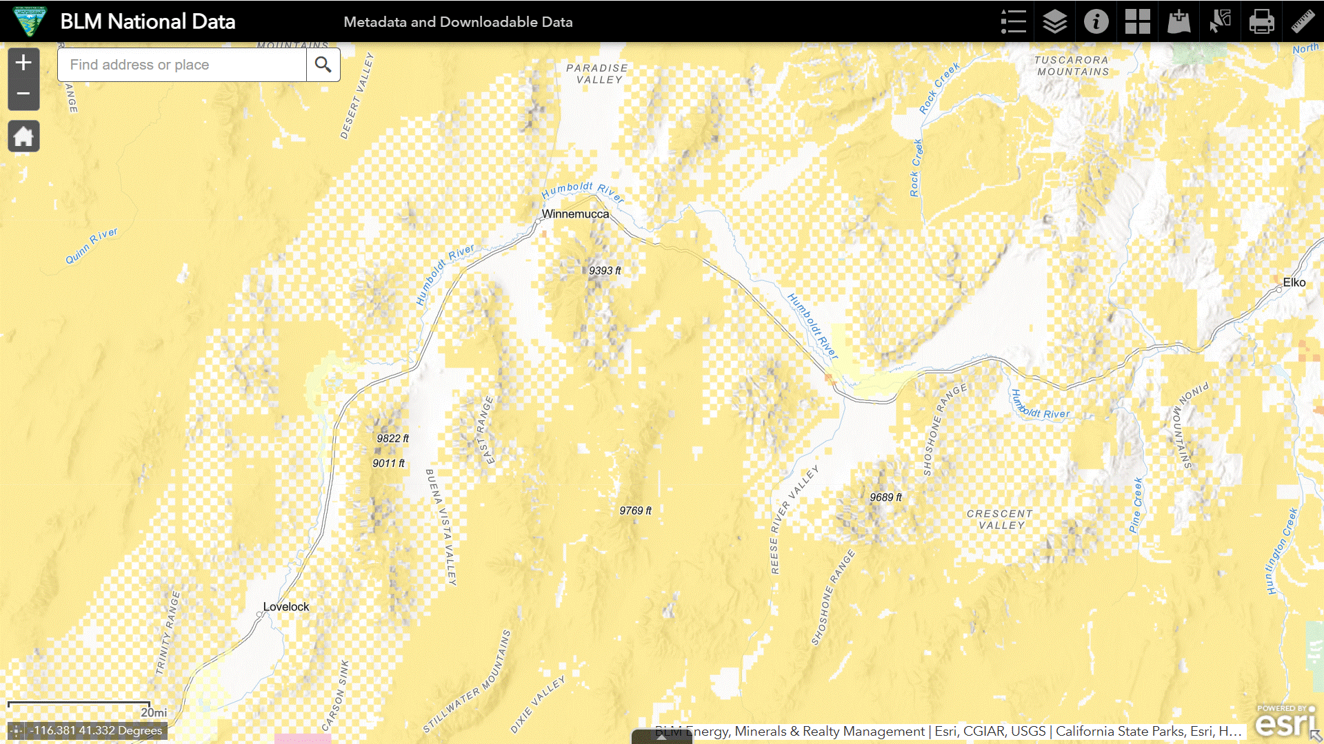 The following maps from the National Data Viewer show land designations along the I-80 corridor from Lovelock to Elko. Click on image to open in new tab.