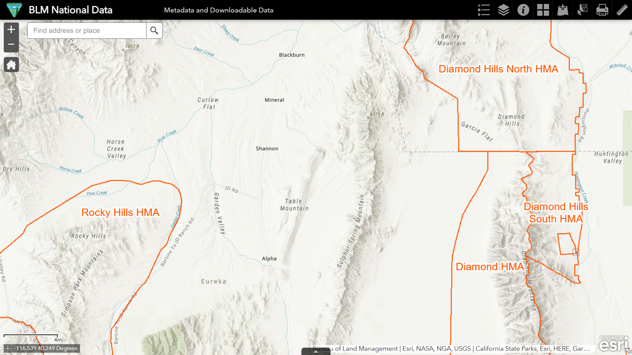 Located between the Rocky Hills and Diamond HMAs, Diamond Springs Ranch covers 994 deeded acres, with grazing preference on three BLM allotments producing 2,100 AUMs per year, according to the listing by Hall and Hall.