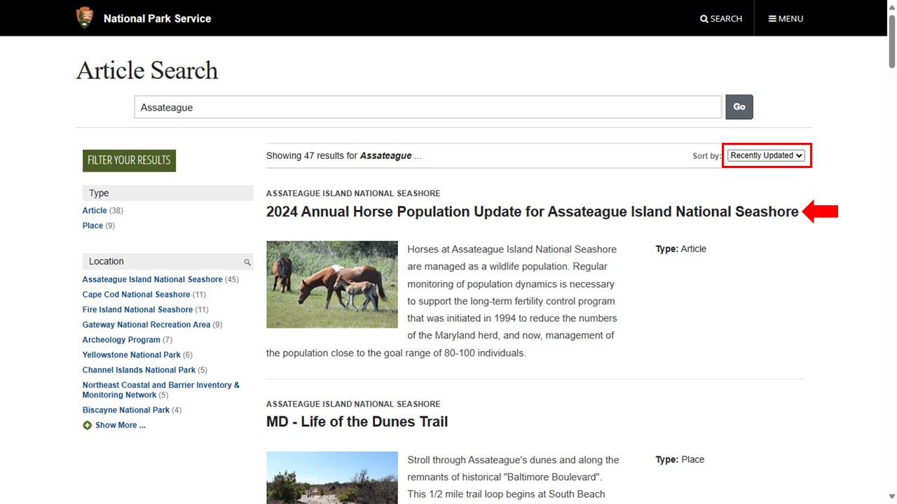 Go to the search page, type in Assateague and hit “Go.”